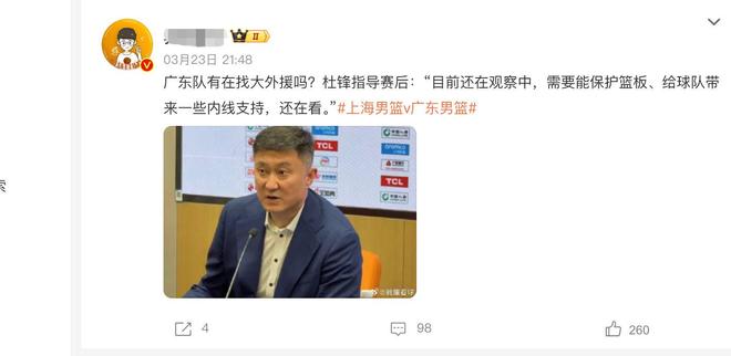 在賽后的采訪當(dāng)中,杜鋒在總結(jié)整個(gè)球隊(duì)出現(xiàn)了一些問(wèn)題之后,也重點(diǎn)提到了外援這一方面的人選。他爆料目前球隊(duì)還在物色新的外援,希望能夠?qū)ふ倚碌拇笸庠畞?lái)幫助球隊(duì)提升內(nèi)線方面的實(shí)力,保護(hù)好籃板。所以從杜鋒透露的這個(gè)消息我們可以了解到,朱芳雨他們其實(shí)正在努力的尋找全新合適的大外援,幫助廣東男籃解決內(nèi)線的這一塊短板。
