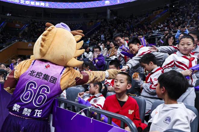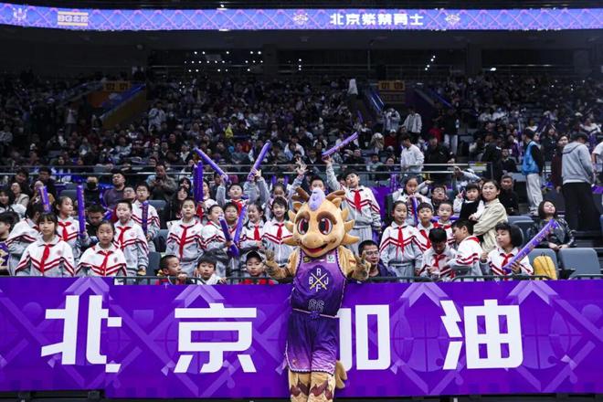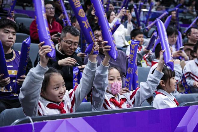 北京市府學(xué)胡同小學(xué)的小球迷們到場為北控男籃加油助威