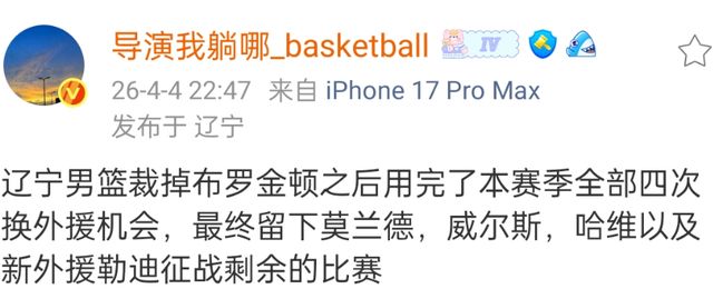 遼寧男籃第二階段使用了三小外援,然而威爾斯、哈維和布羅金頓可以說(shuō)是半斤八兩,由于補(bǔ)充了大外援杰登勒迪,所以要裁掉一名小外援,根據(jù)直播吧以及媒體人報(bào)道,布羅金頓確定會(huì)離開(kāi)遼寧男籃。