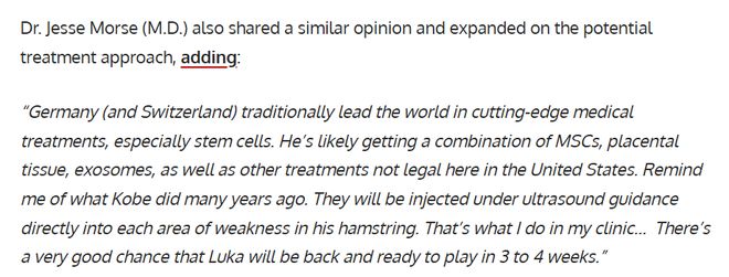 名醫(yī)杰西-莫斯也持有相似觀點(diǎn),并進(jìn)一步解讀了可能采用的治療方案:“德國(guó)(以及瑞士)在尖端醫(yī)療領(lǐng)域,尤其是干細(xì)胞治療方面,一直處于世界領(lǐng)先水平。他很可能會(huì)接受間充質(zhì)干細(xì)胞、胎盤組織、外泌體等聯(lián)合治療,其中一些療法在美國(guó)尚未獲批。這讓我想起多年前科比做過(guò)的治療。這些藥劑會(huì)在超聲引導(dǎo)下,直接注射到腿筋每一處受損薄弱的位置——這也是我在診所里采用的方案……東契奇非常有希望在3到4周內(nèi)康復(fù)并復(fù)出?!?/p>
