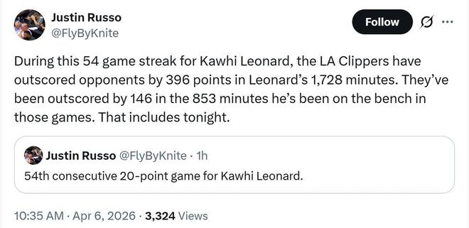 在這54場比賽中,小卡合計(jì)出戰(zhàn)1728分鐘,快船累計(jì)凈勝396分,而在其休息的853分鐘里面,快船隊(duì)凈負(fù)146分。