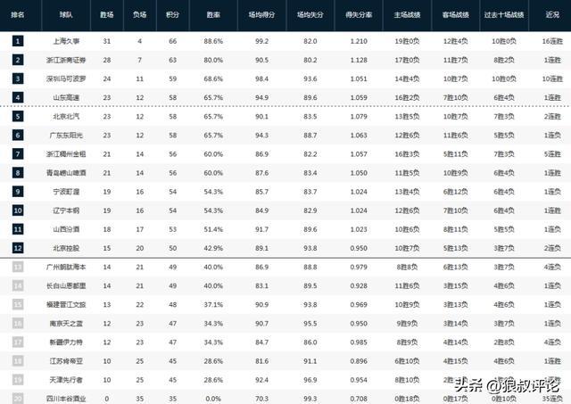 北京總戰(zhàn)績來到了23勝12負,排在積分榜第5的位置,與廣東,山東相同的戰(zhàn)績。