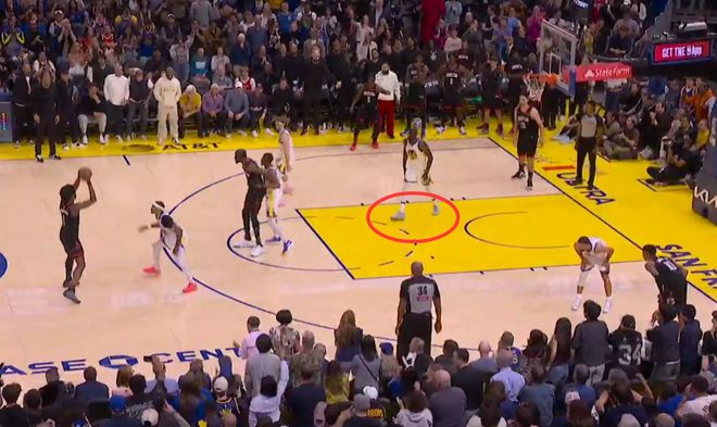 第三次漏判發(fā)生在距離比賽結(jié)束還有46秒時(shí),勇士的格林在沒有積極防守對方球員的前提下,在己方禁區(qū)停留時(shí)間超過三秒,這是一次漏吹的防守三秒違例。這次漏判是火箭吃虧,勇士獲利。