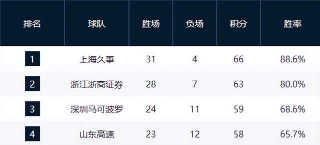 上海久事以32勝3負(fù)高居榜首,領(lǐng)先第二名浙江廣廈3個(gè)勝場(chǎng),冠軍獎(jiǎng)杯已近在咫尺。球隊(duì)攻防兩端穩(wěn)定性極強(qiáng),核心球員狀態(tài)持續(xù)在線,基本鎖定本賽季常規(guī)賽頭名。廣廈雖同樣取勝,但與上海的勝場(chǎng)差距已難以彌補(bǔ),爭(zhēng)冠希望渺茫,重心或?qū)⑥D(zhuǎn)向季后賽深度布局。