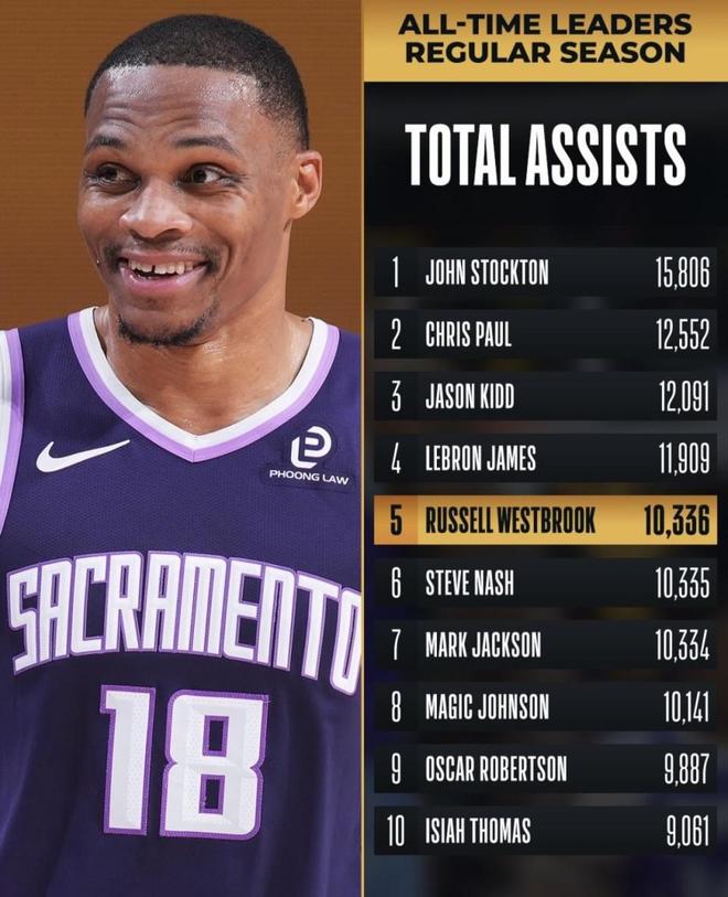 3月18日,聯(lián)盟官宣了一個(gè)硬核消息:威斯布魯克的生涯總助攻正式?jīng)_到了歷史第5。他在對(duì)陣馬刺的那場(chǎng)比賽里,一口氣超了馬克·杰克遜和納什,排名連跳兩級(jí)。