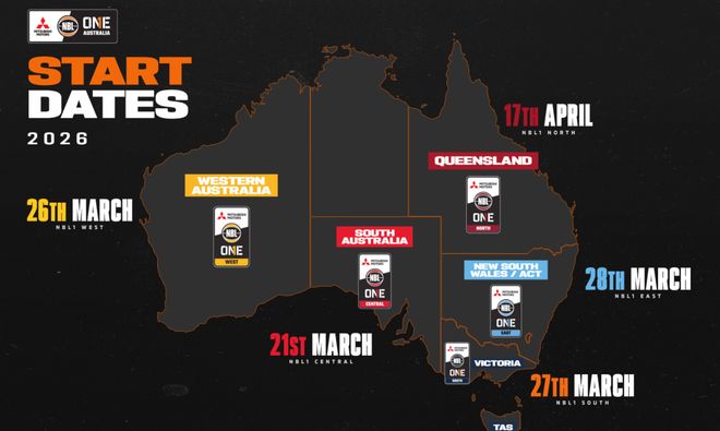 NBL1級聯(lián)賽分成南、北、中、西和東等5個賽區(qū),各自打分區(qū)的比賽,合計72支球隊。