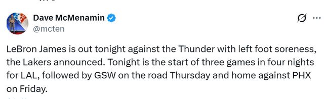 詹姆斯左腳酸痛缺戰(zhàn)雷霆!湖人三巨頭集體缺陣 上次交鋒狂輸43分
