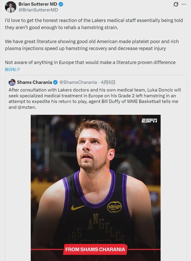 也有人對(duì)他倆此舉表示質(zhì)疑,另一個(gè)醫(yī)學(xué)專(zhuān)家Brian Sutterer寫(xiě)道:“湖人隊(duì)醫(yī)難道連腿筋治療都做不好?不理解他們?yōu)楹稳W洲,沒(méi)有文獻(xiàn)能證明歐洲具備更好方案!”阿里納斯說(shuō)道:“有些在美國(guó)違禁的治療手段,在歐洲是合法的?!?/p>