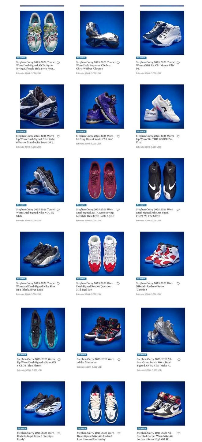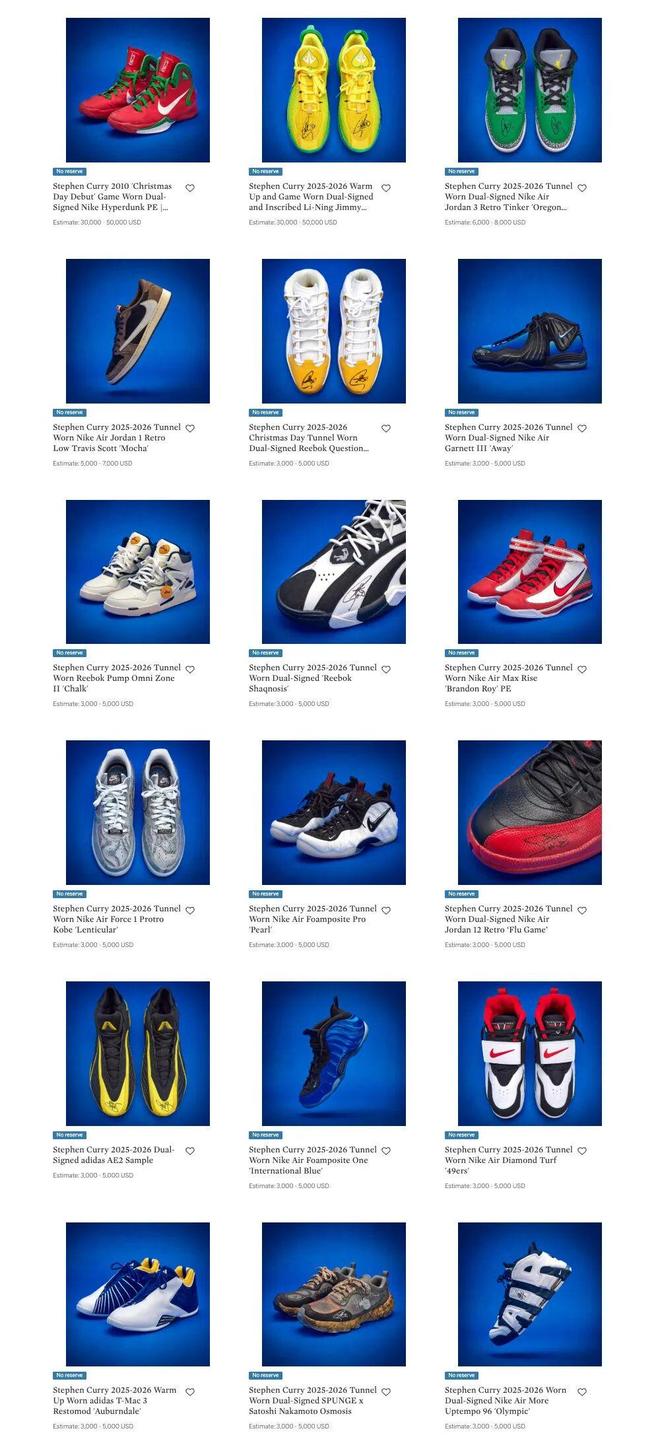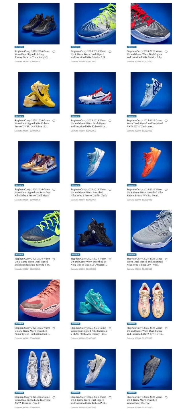 目前這些鞋款已經(jīng)亮相蘇富比網(wǎng)站,每一雙鞋都進(jìn)行了精美的拍攝展示,可以看到有些鞋款上還有庫里的親筆簽名。