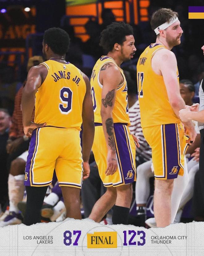 第四節(jié)雙方換上純替補(bǔ)陣容,雷霆單節(jié)30-25凈勝5分。全場結(jié)束,雷霆123-87大勝湖人36分,本賽季4比0橫掃湖人。這四場比賽,雷霆分別凈勝29分、9分、43分和36分,合計(jì)117分。最近一周,雷霆兩次跟湖人交手,贏了79分!