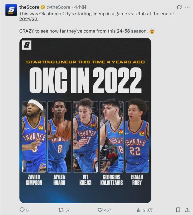 雷霆首發(fā):亞歷山大、阿杰伊-米切爾、多爾特、霍姆格倫、哈滕。過去22場雷霆豪取20勝2負(fù),只輸給了活塞和凱爾特人。美媒TheScore曬出雷霆2021-22賽季常規(guī)賽收官階段的首發(fā):“雷霆從24勝58負(fù)一路走來,太不可思議了。”