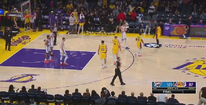 最終雷霆123-87狂虐湖人,贏了36分之多,且每節(jié)都是凈勝。