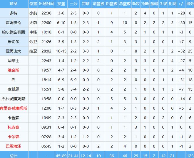 湖人那邊最大牌的18屆狀元郎艾頓,看似打了好像又沒打,約23分鐘里僅出手4次中1球得到3分3板1帽,正負(fù)值-26并列全場(chǎng)最低。