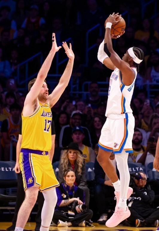 第二節(jié)八村塁一人連拿5分,湖人在9分24秒追到36-36。后半段湖人隊在場上進(jìn)攻啞火,半場最后6分鐘湖人僅僅命中了一記運動戰(zhàn)投籃。雷霆隊在場上趁機(jī)打出了一波14-0的攻擊波,半場比賽結(jié)束時,雷霆65-47領(lǐng)先18分。