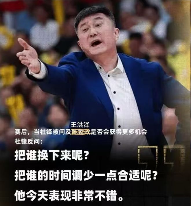 加時(shí)賽,王洪澤直接上演一記雙手暴扣,幫助廣東把領(lǐng)先優(yōu)勢擴(kuò)大至4分??紤]到此前陳家政在對(duì)陣四川的比賽有著出色表現(xiàn),在被問及是否能獲得更多機(jī)會(huì)時(shí),卻在賽后被杜鋒來了句:“那把誰換下來呢”。所以這場王洪澤打出優(yōu)異表現(xiàn),也讓球迷調(diào)侃道:“賽后,當(dāng)杜鋒被問及王洪澤是否會(huì)獲得更多機(jī)會(huì)?”