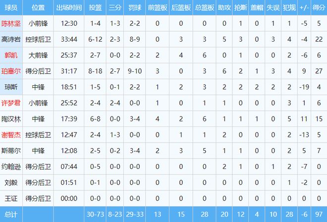 本場(chǎng)比賽,珀塞爾出場(chǎng)時(shí)間超過(guò)30分鐘,得到27分3籃板6助攻2搶斷。高詩(shī)巖找回進(jìn)攻感覺(jué),貢獻(xiàn)22分3籃板5助攻3搶斷。陶漢林得到15分6籃板,是山東隊(duì)在場(chǎng)效果最好的球員,正負(fù)值為15。其他球員沒(méi)有人得分上雙。約翰遜狀態(tài)奇差,5投0中一分未得。瓊斯打了19分鐘,僅得到4分,正負(fù)值為-19。斯蒂爾7分5籃板,末節(jié)被棄用。廣廈隊(duì)外援塔克砍下36分15籃板12助攻的大號(hào)三雙。