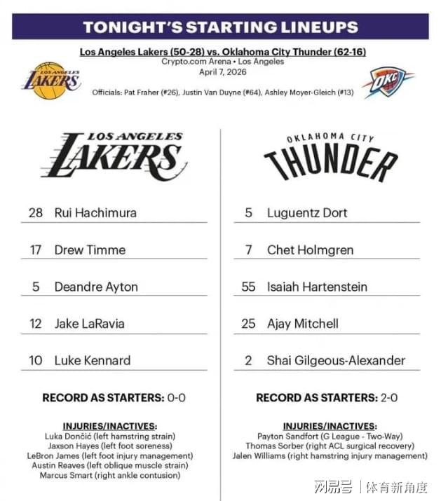 話說湖人主場迎戰(zhàn)雷霆,那雷霆可是衛(wèi)冕冠軍,氣勢洶洶如猛虎下山。而湖人呢,季后賽席位已經(jīng)穩(wěn)穩(wěn)當(dāng)當(dāng),干脆來了個“戰(zhàn)略性躺平”。賽前傷病報告一出,好家伙,阿king(詹姆斯)左腳“受傷”,需要“精心呵護”;東子和小里,一個左腿筋拉傷,一個左側(cè)腹斜肌拉傷,仿佛商量好了似的;斯瑪特右腳踝“不慎”挫傷,海斯左莫名”酸痛,都不打了。這傷病名單,簡直比劇本還精彩!