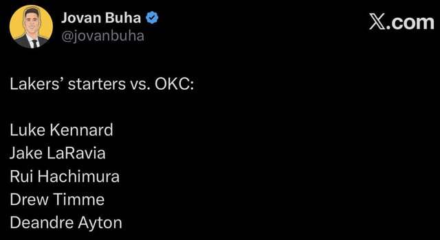 湖人今天打雷霆的首發(fā)名單流出來,Luke Kennard、Jake LaRavia、Rui Hachimura、Drew Timme、Deandre Ayton——這陣容不像NBA,像2K里把傷病名單全打開后的強(qiáng)制輪換。Buha爆料時(shí)特意標(biāo)注了消息源,但沒人關(guān)心來源,所有人都在數(shù):這5個(gè)人里,有幾個(gè)是賽季初就在湖人的?