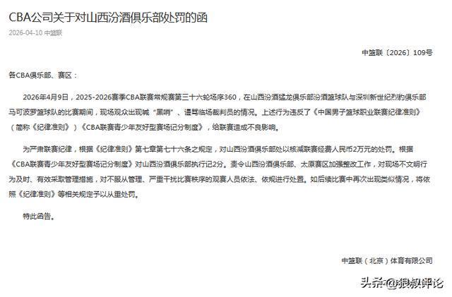 北京時(shí)間4月10日,CBA官方再次開出罰單,山西主場(chǎng)觀眾喊“黑哨”、謾罵裁判員 核減聯(lián)賽經(jīng)費(fèi)2萬元。