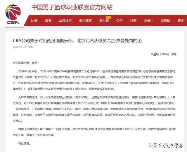 2026年4月9日,2025-2026賽季CBA聯(lián)賽常規(guī)賽第三十六輪場(chǎng)序360,在山西汾酒猛龍俱樂部汾酒籃球隊(duì)與深圳新世紀(jì)烈豹俱樂部馬可波羅籃球隊(duì)的比賽期間,現(xiàn)場(chǎng)觀眾出現(xiàn)喊“黑哨”、謾罵臨場(chǎng)裁判員的情況。上述行為違反了《中國(guó)男子籃球職業(yè)聯(lián)賽紀(jì)律準(zhǔn)則》(簡(jiǎn)稱《紀(jì)律準(zhǔn)則》)《CBA聯(lián)賽青少年友好型賽場(chǎng)記分制度》,給聯(lián)賽造成不良影響。