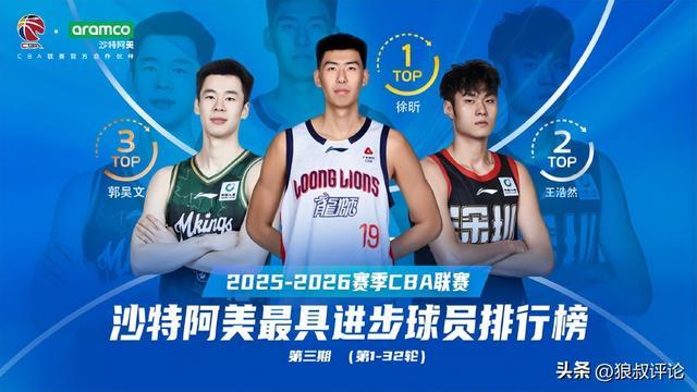 根據(jù)CBA官方的公示,2025-2026賽季CBA聯(lián)賽第1-32輪沙特阿美最具進(jìn)步球員排名第一的是徐昕,隨后分別是郭昊文,王浩然。
