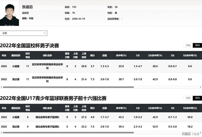 更炸裂的是,有網友爆料稱,張涵泊在2019年和2005年出生的楊瀚森同屆打過全國U15的預賽,而籃協官網比賽記錄顯示,張涵泊確實在2019年和2021年參加了兩次U15比賽,前一次表現平平,但后一次明顯數據全面提升。