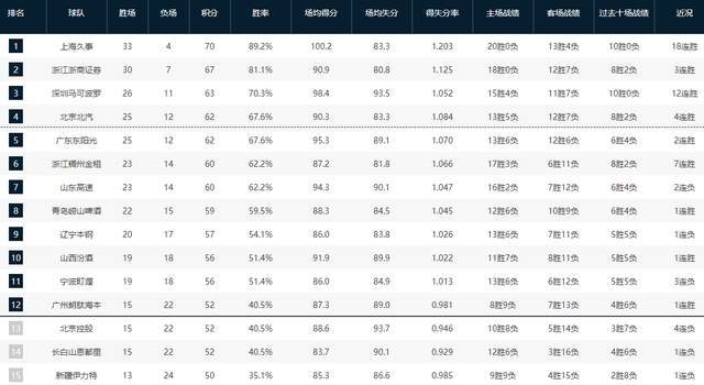 CBA常規(guī)賽第37輪已經(jīng)全部打完,在最后沖刺階段,各支球隊都是全力上演季后賽卡位爭奪戰(zhàn)。本輪較量中,浙江男籃95-72大勝山東男籃,天津男籃111-86大勝四川男籃,深圳男籃93-88險勝江蘇男籃,廣州男籃95-81擊敗南京同曦,山西男籃93-86力克新疆男籃,浙江廣廈93-85逆轉(zhuǎn)寧波男籃,廣東男籃117-84大勝吉林男籃,北京首鋼84-65輕取北控男籃,遼寧男籃96-98惜敗青島男籃,上海男籃119-116險勝福建男籃。經(jīng)過這輪精彩廝殺之后,CBA排名又發(fā)生了大變化,上海男籃18連勝獨占鰲頭,深圳男籃12連勝殺回第三的位置,北京首鋼4連勝穩(wěn)坐第四,山東男籃兩連敗被打回原形,遼寧男籃輸球依舊排名第九。