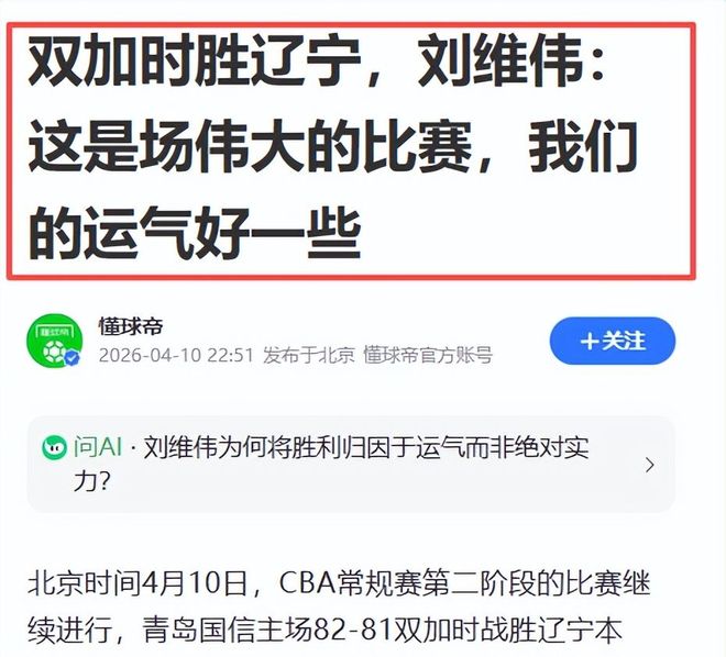 雙加時(shí)鏖戰(zhàn)后的復(fù)盤(pán)時(shí)刻,主帥聲音往往承載最多信息量。青島主帥劉維偉的賽后表態(tài),沒(méi)有渲染勝利喜悅,亦未回避自身短板,寥寥數(shù)語(yǔ),直抵競(jìng)技本質(zhì)。