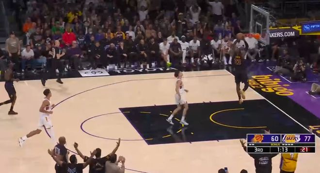 第三節(jié),詹姆斯依然狀態(tài)火熱,他在這一節(jié)單節(jié)拿下5分3籃板4助攻,剩下1分鐘前,詹姆斯還完成了一記搶斷扣籃。
