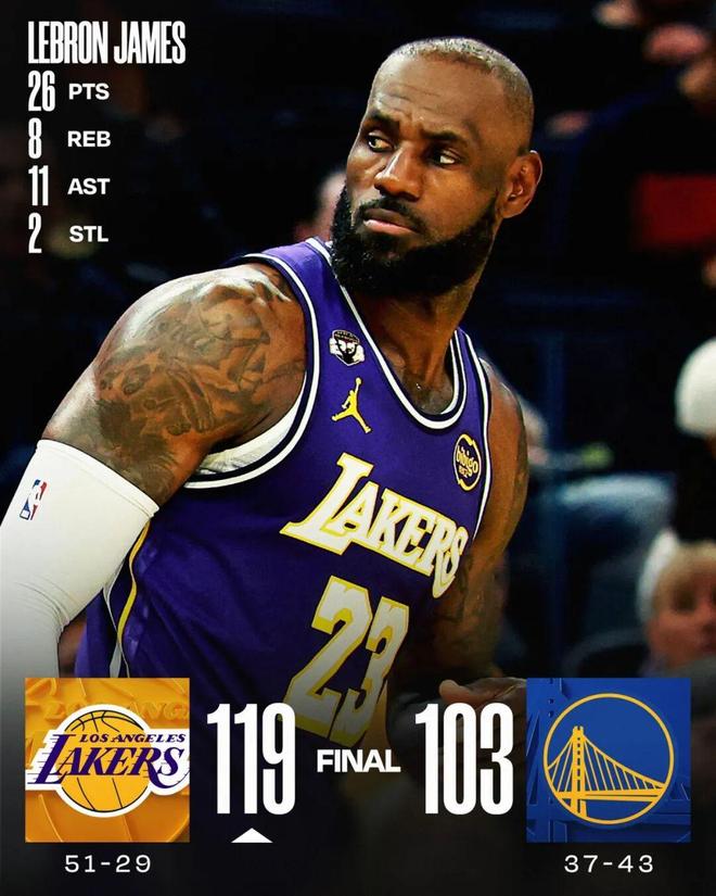 而在上一場(chǎng),湖人119-103戰(zhàn)勝勇士,結(jié)束三連敗,這場(chǎng)比賽的詹姆斯:全場(chǎng)出戰(zhàn)32分鐘,投籃17中11,三分5中3,得到26分8籃板11助攻。