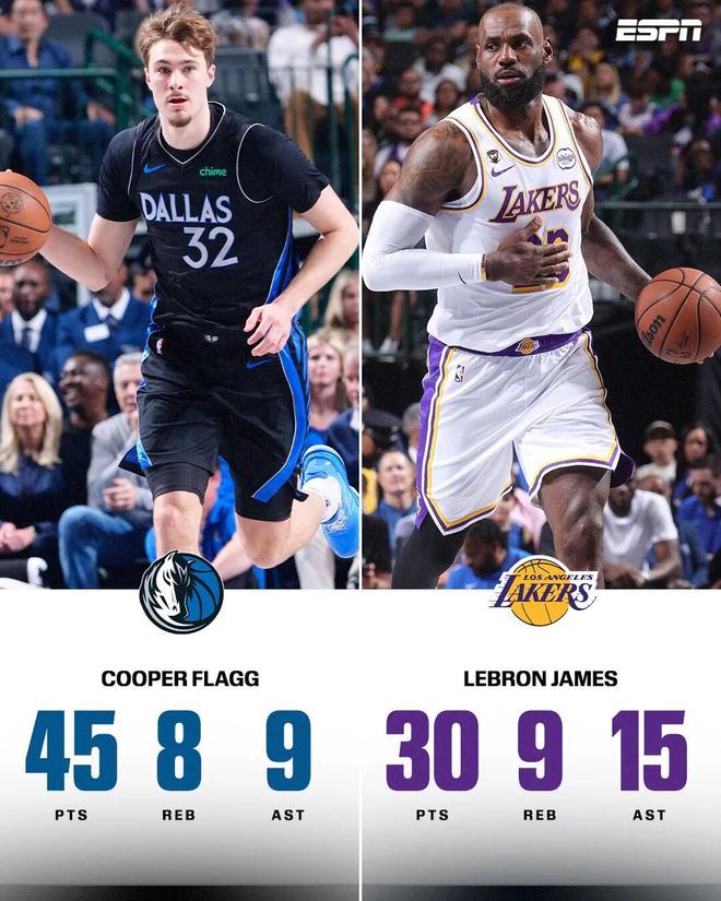當(dāng)時(shí)面對(duì)獨(dú)行俠,東契奇、里夫斯缺席,詹姆斯全場(chǎng)22中12,拿下30分9籃板15助攻,僅差1籃板就能達(dá)成30+10+15的大號(hào)三雙,可惜這場(chǎng)湖人輸給了拿了45+8+9的弗拉格。