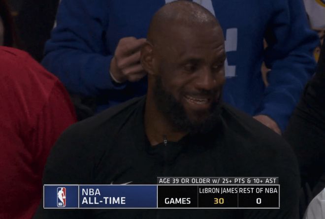 這個(gè)紀(jì)錄很有意思,因?yàn)樵?9歲之后,NBA除了詹姆斯就沒有其他任何一個(gè)球員做到25分+10助攻了,而39歲之后的詹姆斯?他一人就做到了30次。