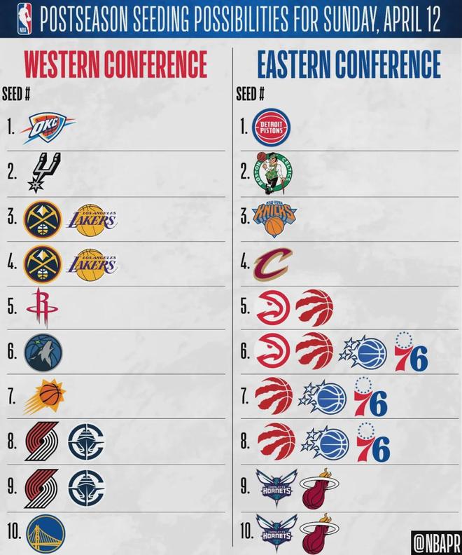 北京時間4月12日,NBA沒有比賽,明天是常規(guī)賽收官日。除了約基奇出戰(zhàn)成疑,掘金其他主力明天都不打。NBA官方今天列出了各隊的排名情況:如果湖人最后一場戰(zhàn)勝爵士,同時掘金輸給馬刺,那么湖人將會升至西部第三。