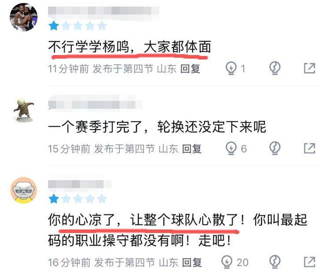 連續(xù)兩場(chǎng)輸給浙江球隊(duì),邱彪此前的言論也遭到球迷調(diào)侃:“邱指導(dǎo),今天心接著涼吧”、“一家人的理念就是自由散漫懶散,換做是鞏導(dǎo)早就罵上了?!鄙踔劣星蛎詣袂癖胂抡n:學(xué)學(xué)楊鳴,大家都體面。