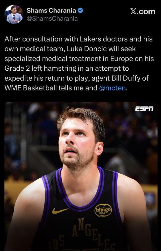 湖人輸給獨(dú)行俠的當(dāng)晚,東契奇做出了一個(gè)讓球迷既感動(dòng)又揪心的決定。他的經(jīng)紀(jì)人Bill Duffy告訴Shams,這位25歲的核心將飛往歐洲接受左腿筋二級(jí)拉傷的專項(xiàng)治療,試圖加速復(fù)出。