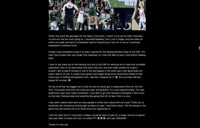 J.Cole解釋,他原計劃參加至少三場CBA比賽,然而,工作簽證的辦理過程比預期要長得多,J.Cole透露自己一周內(nèi)錄制了多個訪談內(nèi)容,然后就必須赴香港等待簽證?!耙兄x我的隊友們,他們表現(xiàn)得非??幔⑶艺嫘南M夷芡哆M一個球!我得以在世界頂級聯(lián)賽之一的比賽中上場8分鐘,雖然有幾次不錯的出手機會,但未能命中。如果再打幾場比賽,或許那些投籃就能逐漸變得手到擒來了!”J.Cole表示CBA聯(lián)賽是世界頂級聯(lián)賽,以及他自己覺得好像得了20分一樣。J.Cole在上一輪南京不敵廣州的比賽出場8分鐘04秒,5次出手沒有命中,他的CBA數(shù)據(jù)定格在1個籃板1次助攻1次犯規(guī)。真沒想到,就這么結束了…