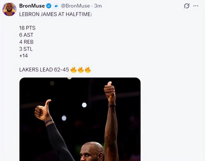 回看本場比賽,由于東契奇和里夫斯都因傷缺陣,開場41歲的詹姆斯就開啟進(jìn)攻模式。整個上半場,詹姆斯出戰(zhàn)了16分33秒,投籃15中6,收下18分6助攻4籃板3搶斷。