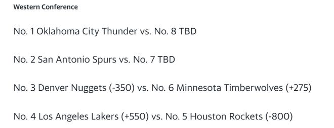西部的情況,掘金(3)VS森林狼(6),掘金+360、森林狼+275,看好掘金晉級(jí);