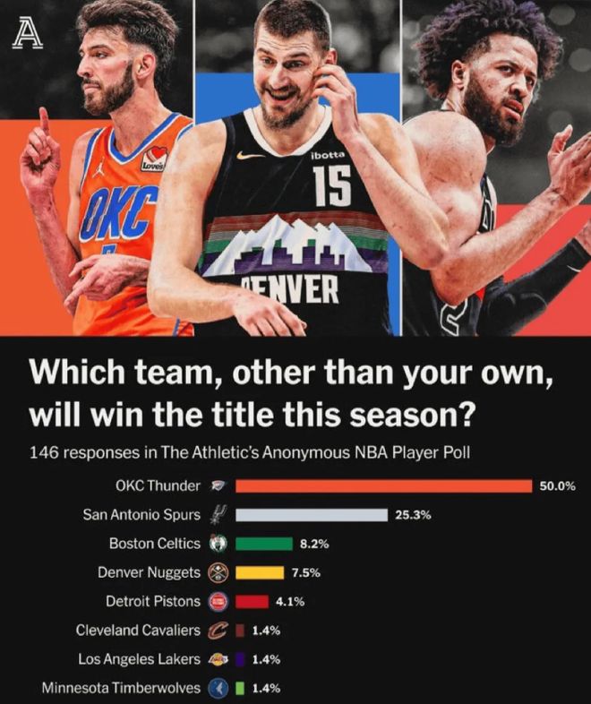4月13日,NBA常規(guī)賽落幕,美國知名媒體《The Athletic》發(fā)布一項(xiàng)球員匿名調(diào)查,問題為:“除了自己球隊(duì),你認(rèn)為哪支球隊(duì)能奪冠?”,結(jié)果在146份調(diào)查中,雷霆被50%的球員認(rèn)為能奪冠,遠(yuǎn)遠(yuǎn)領(lǐng)先第二名馬刺的25.3%。