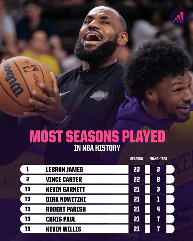 2.詹姆斯打完了職業(yè)生涯第23個賽季歷史第一,第二的是卡特;
