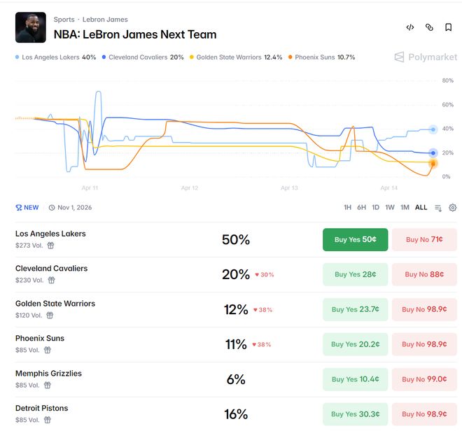 進入休賽期詹姆斯去哪兒又將成為年度大戲,根據(jù)數(shù)據(jù)媒體的預測,留守湖人隊的概率50%,回歸騎士隊的概率20%,去活塞的概率16%。