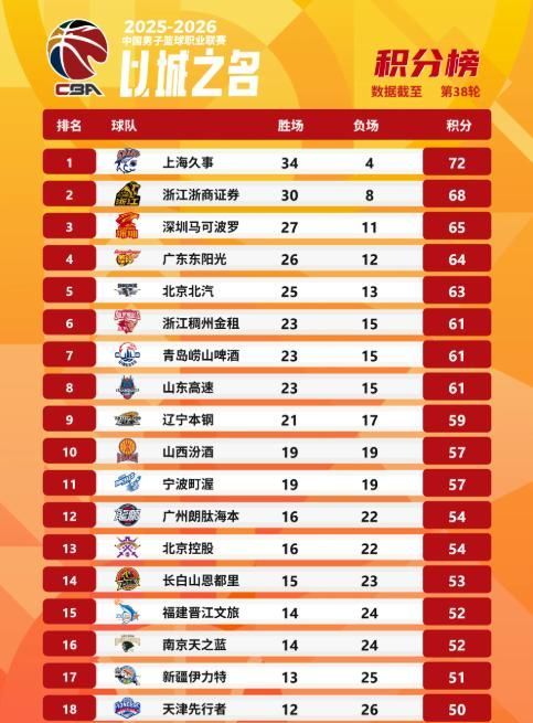 截至4月13日夜間更新的CBA積分榜顯示:上海男籃以34勝4負(fù)傲視群雄,提前鎖定常規(guī)賽頭名;廣廈與深圳分列第二、第三;廣東隊?wèi)?zhàn)績?yōu)?6勝12負(fù),暫居第四;北京首鋼則以25勝13負(fù)緊隨其后,排名第五。