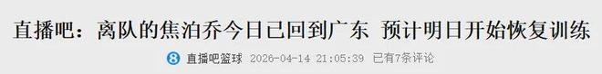 國內(nèi)知名籃球平臺:焦泊喬已回歸廣東隊,即將恢復訓練。