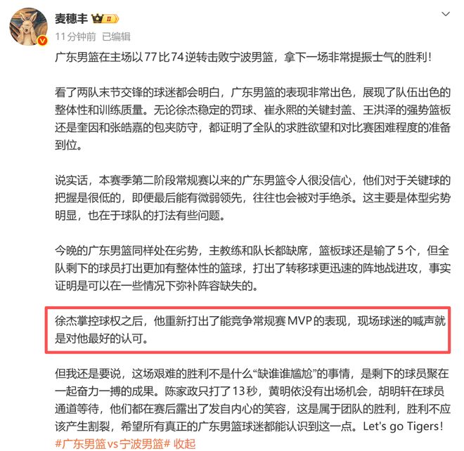 此前一段時(shí)間,徐杰的狀態(tài)和球隊(duì)對(duì)于他的戰(zhàn)術(shù)安排,也讓他飽受質(zhì)疑,賽后徐杰在接受媒體采訪時(shí)也表示:“自己應(yīng)在困難時(shí)站出來(lái),而不是把球撇出去就躲在旁邊。”而本場(chǎng)比賽的表現(xiàn)更是證明,只要給足徐杰球權(quán),他便能扛起球隊(duì)。
