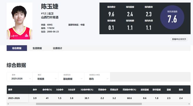 陳玉婕身高1.78米,她在進(jìn)入季后賽后的表現(xiàn)一言難盡,1分、9分、7分、4分、6分。場(chǎng)均18.3分鐘,拿到5.4分2助攻2.2籃板0.8搶斷,命中率29%,三分命中率13.3%,表現(xiàn)可以說(shuō)是拉胯至極。