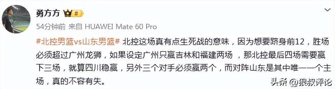 媒體人方方發(fā)文點(diǎn)評(píng):“北控這場(chǎng)真有點(diǎn)生死戰(zhàn)的意味,因?yàn)橄胍Q身前12,勝場(chǎng)必須超過廣州龍獅,如果設(shè)定廣州只贏吉林和福建兩場(chǎng) ,那北控最后四場(chǎng)需要贏下三場(chǎng),就算四川穩(wěn)贏,另外三個(gè)對(duì)手必須贏兩個(gè),而對(duì)陣山東是其中唯一一個(gè)主場(chǎng),真的不容有失。 ”