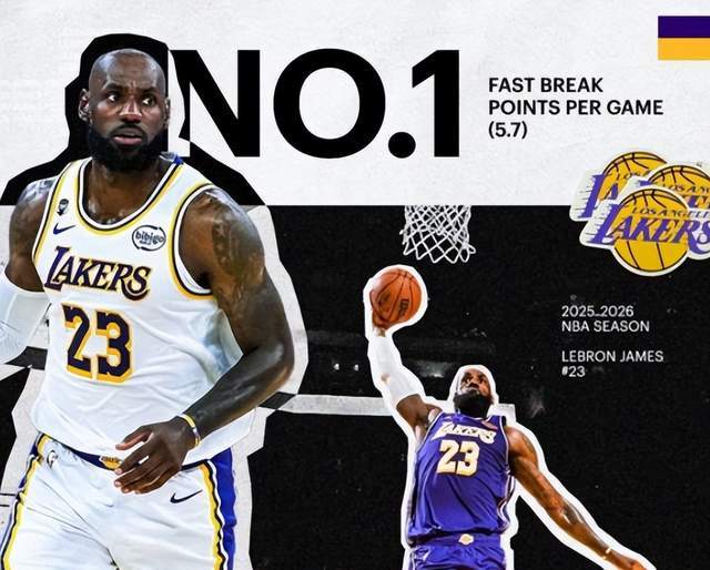 根據(jù)媒體統(tǒng)計顯示,從2019年到2026年8個賽季,詹姆斯分別在2019、2022、2023、2026先后四個賽季排名聯(lián)盟快攻得分榜單第一,此外分別在2020、2021、2024三個賽季排名榜單第二,2025年則是稍微下滑到第四。