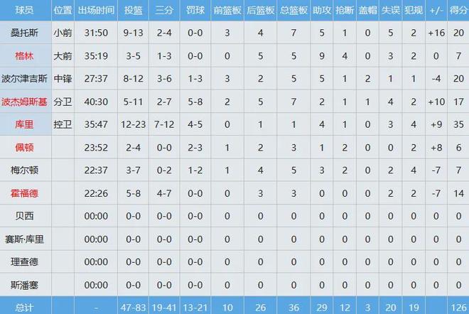 此役勇士五人得分上雙,庫里35分4助,桑托斯20分7板5助,波爾津吉斯20分5板5助,霍福德14分3板。