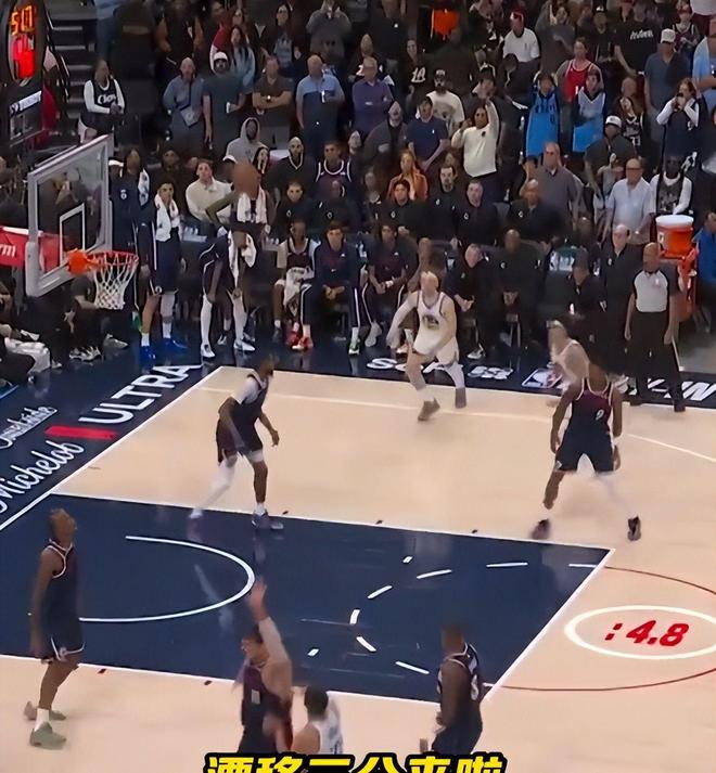 比賽進(jìn)入最后兩分鐘,快船115:114僅領(lǐng)先1分?;舾5略俣韧ι矶?,在左側(cè)45度角命中本場(chǎng)第四記三分,勇士117:115反超——這是他們自首節(jié)14:14平后首次取得領(lǐng)先!