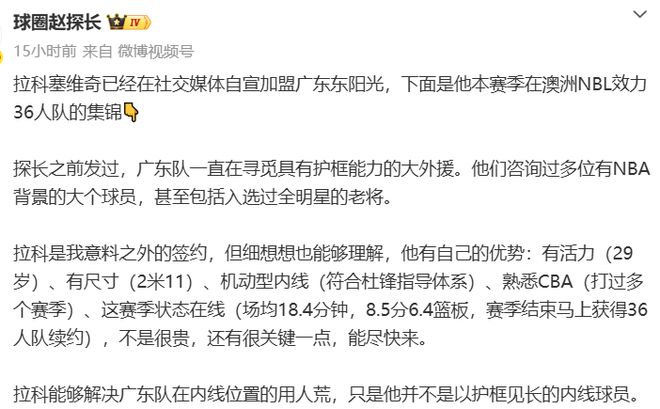 其次,據(jù)“趙探長(zhǎng)”的報(bào)道,在薩姆納、薩林杰養(yǎng)傷期間,廣東隊(duì)一直在尋覓具有護(hù)框能力的大外,還咨詢過多位有NBA背景的大個(gè)球員,甚至包括入選過全明星的老將,但選來選去,廣東隊(duì)最終還是確定了護(hù)框能力不是那么強(qiáng)的拉科,一方面是便宜,另一方面是他能盡快來。